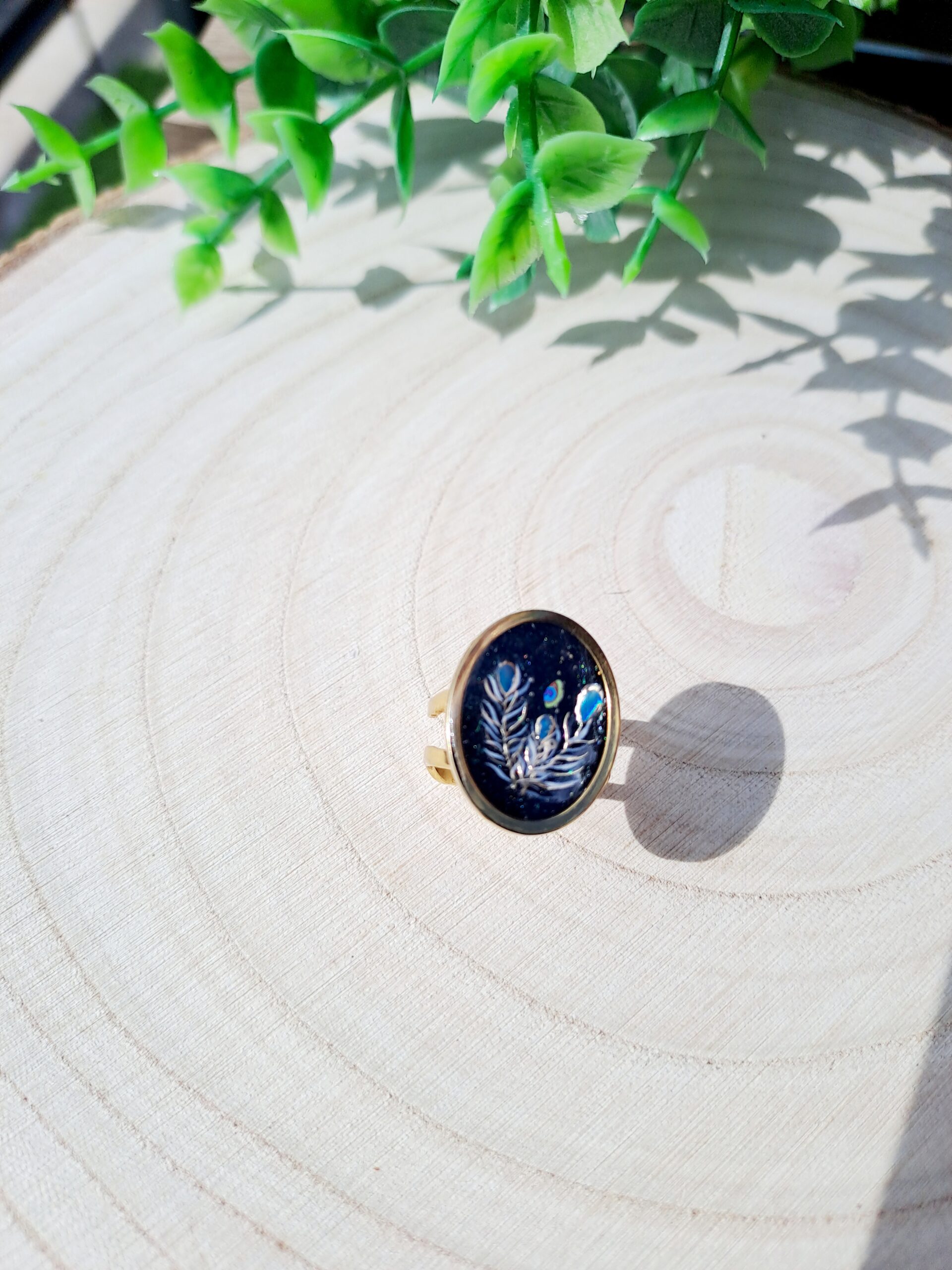 Bague en résine motif fleur de cerisier sur fond bleu.