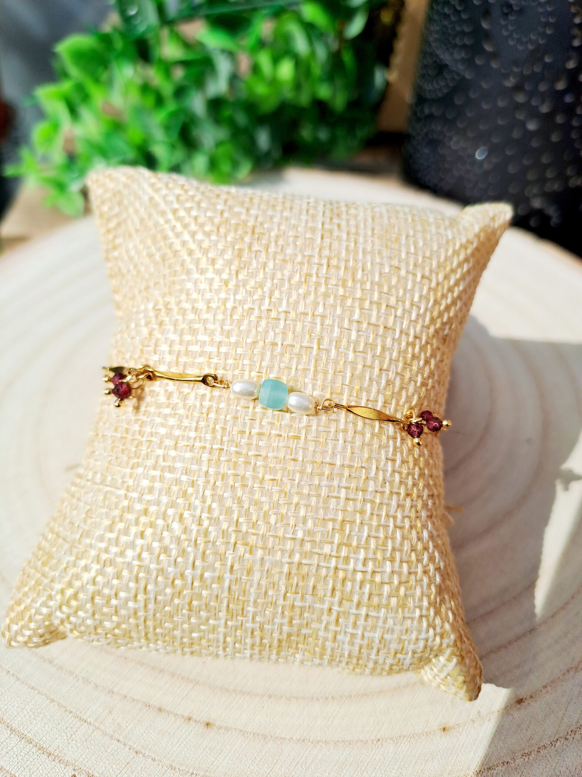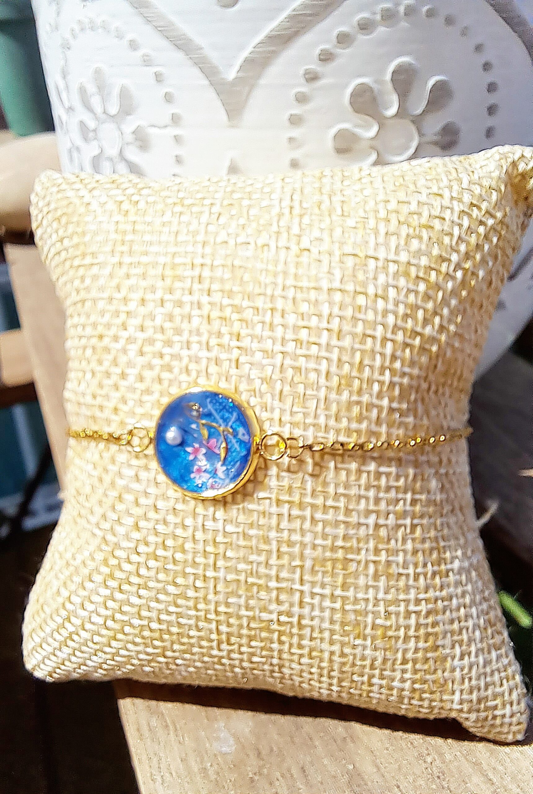 Bracelet en résine motif fleur de cerisier sur fond bleu.