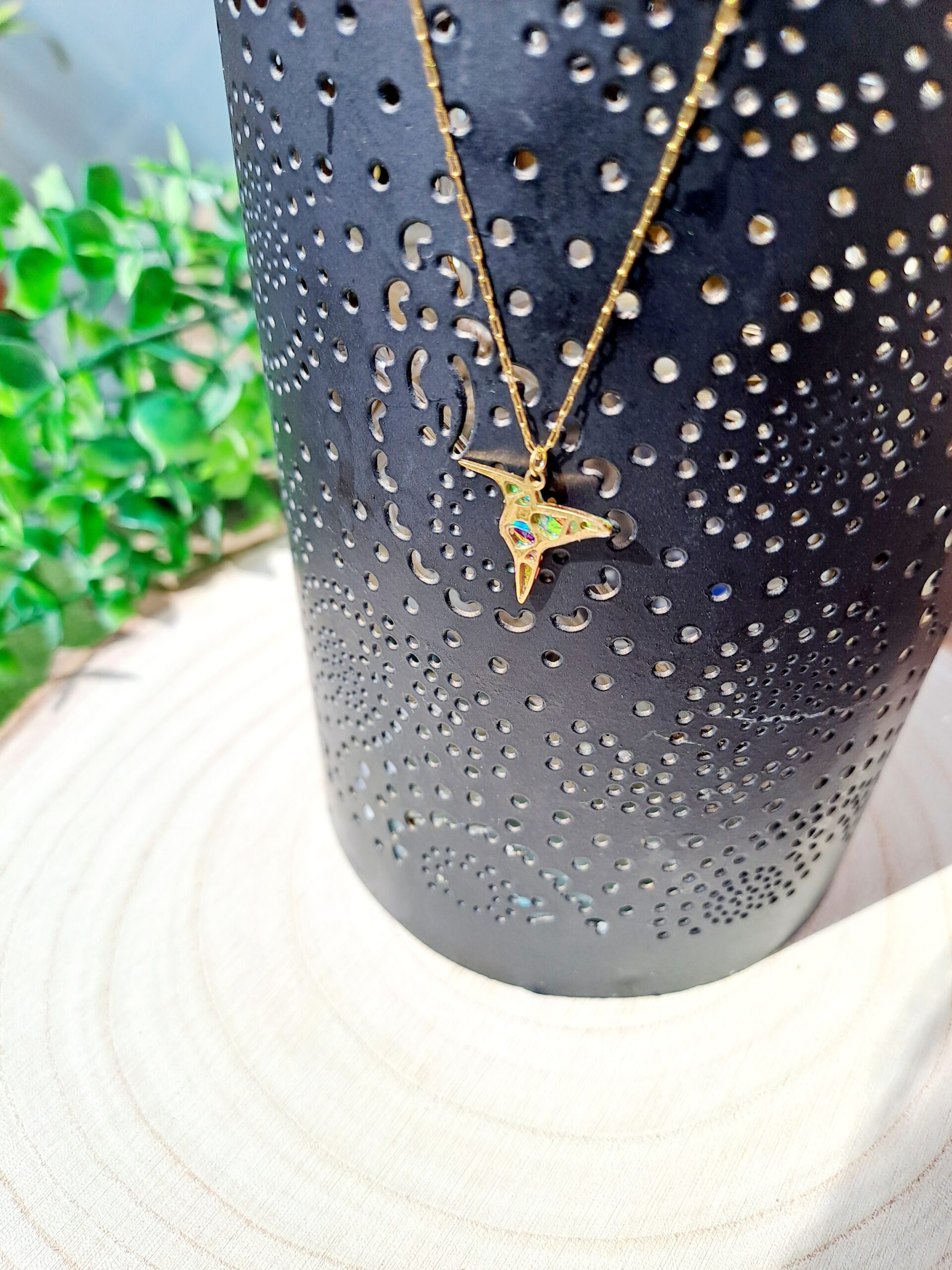 Pendentif colibri orné de feuilles irisées aux reflets changeants qui rappellent la magie des vitraux.